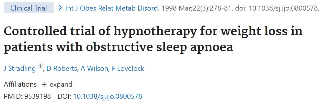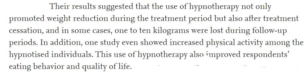 "Leurs résultats suggèrent que l'utilisation de l'hypnothérapie favorise non seulement la réduction du poids pendant la période de l'hypnose mais aussi après l'arrêt, et dans certains cas, un à dix kilos ont été perdus pendant les périodes de suivi. En outre, une étude a même montré une augmentation de l'activité physique chez les personnes hypnotisées. Cette utilisation de l'hypnothérapie a également amélioré le comportement alimentaire et la qualité de vie des personnes interrogées."